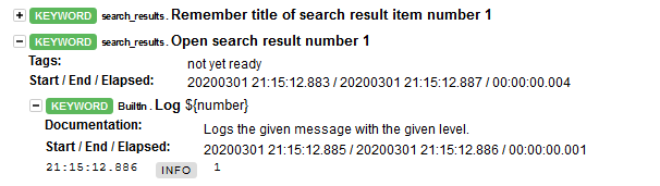 A very nice feature of Robot Framework allows you to embed placeholders in the names of the keywords, which leads to dynamic discovery of applicable keywords. For example, consider the URL address that needs to be opened at the beginning of the test. It may seem fixed - at least in our example. Under usual circumstances you wouldn’t be testing a production system. Instead you would have one or more test systems, maybe even a local deployment, so this keyword simply cannot have the URL embedded in it. Let’s write it with a placeholder instead: